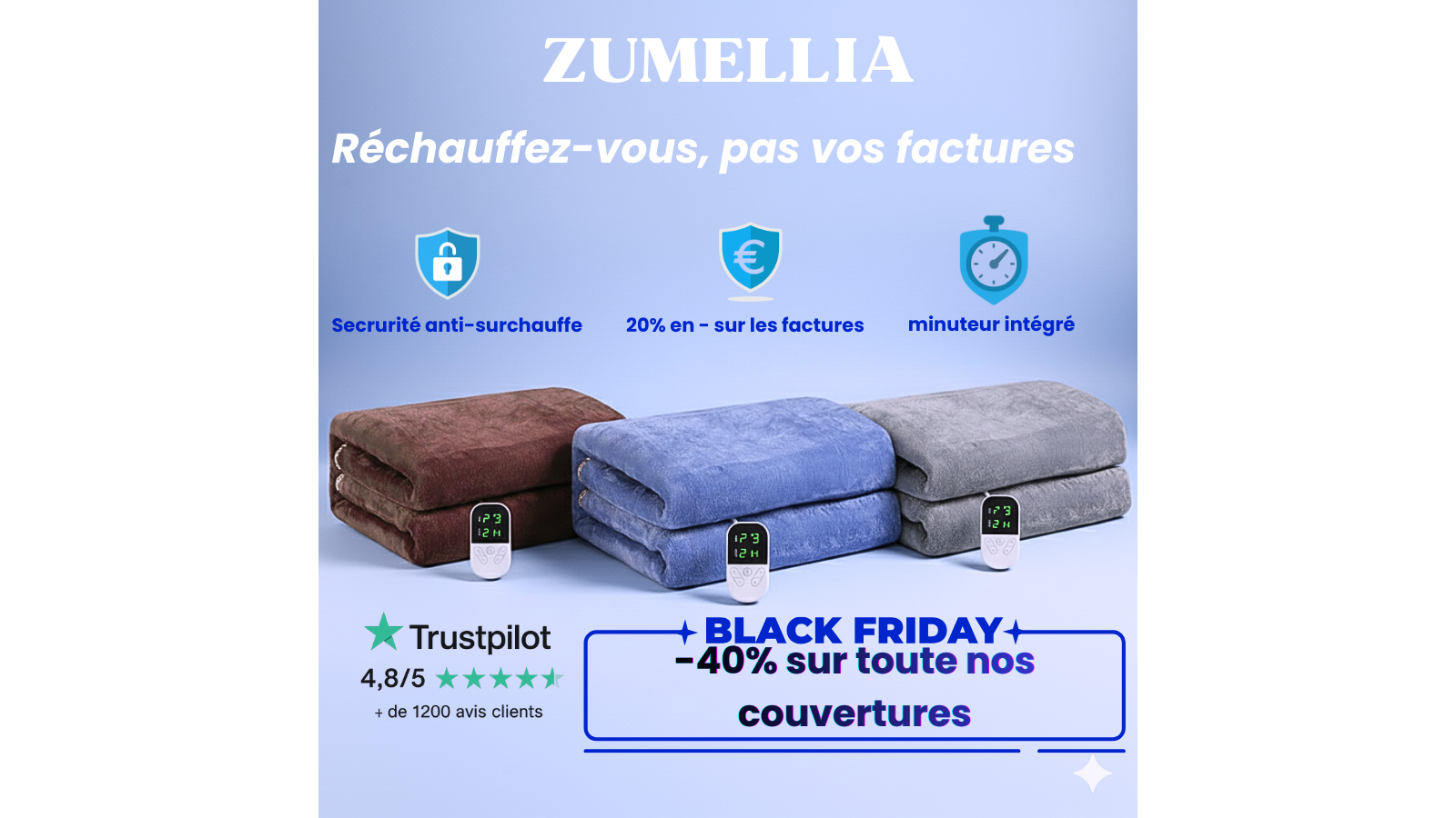 À puissance maximale, notre couverture chauffante ne consomme qu’environ 5 centimes de l’heure, contre 15 à 30 centimes pour un radiateur électrique classique.